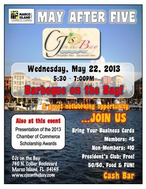 If you’re here on the 22nd of May, the Marco Island Chamber of Commerce has an event for you. It’s the Chamber’s May After Five get-together featuring “Barbeque on the Bay”. The venue is CJ’s on the Bay, 740 North Collier Boulevard.